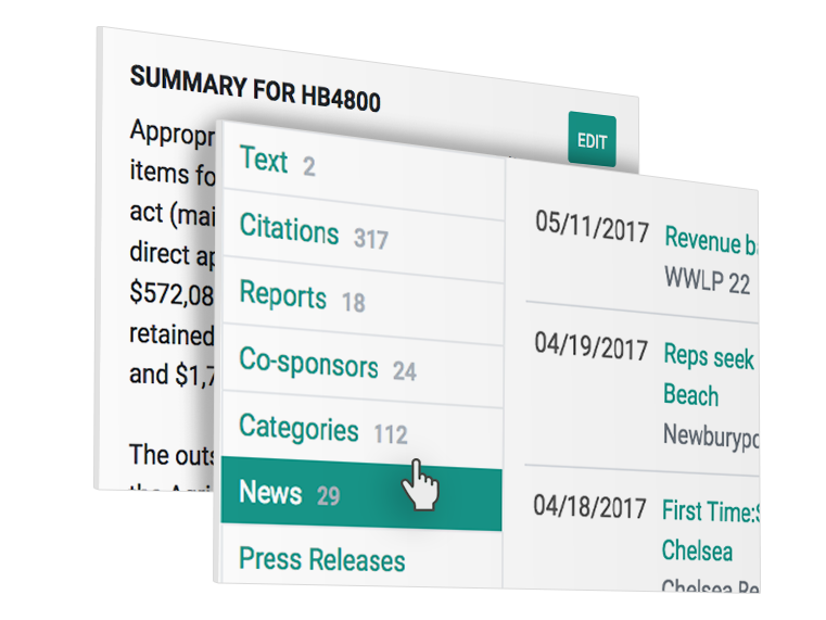 Receive notifications of potential changes to governing statutes, or impacts to your municipality. Follow budgets and track line items - between gubernatorial, House & Senate versions. See line item changes over time.